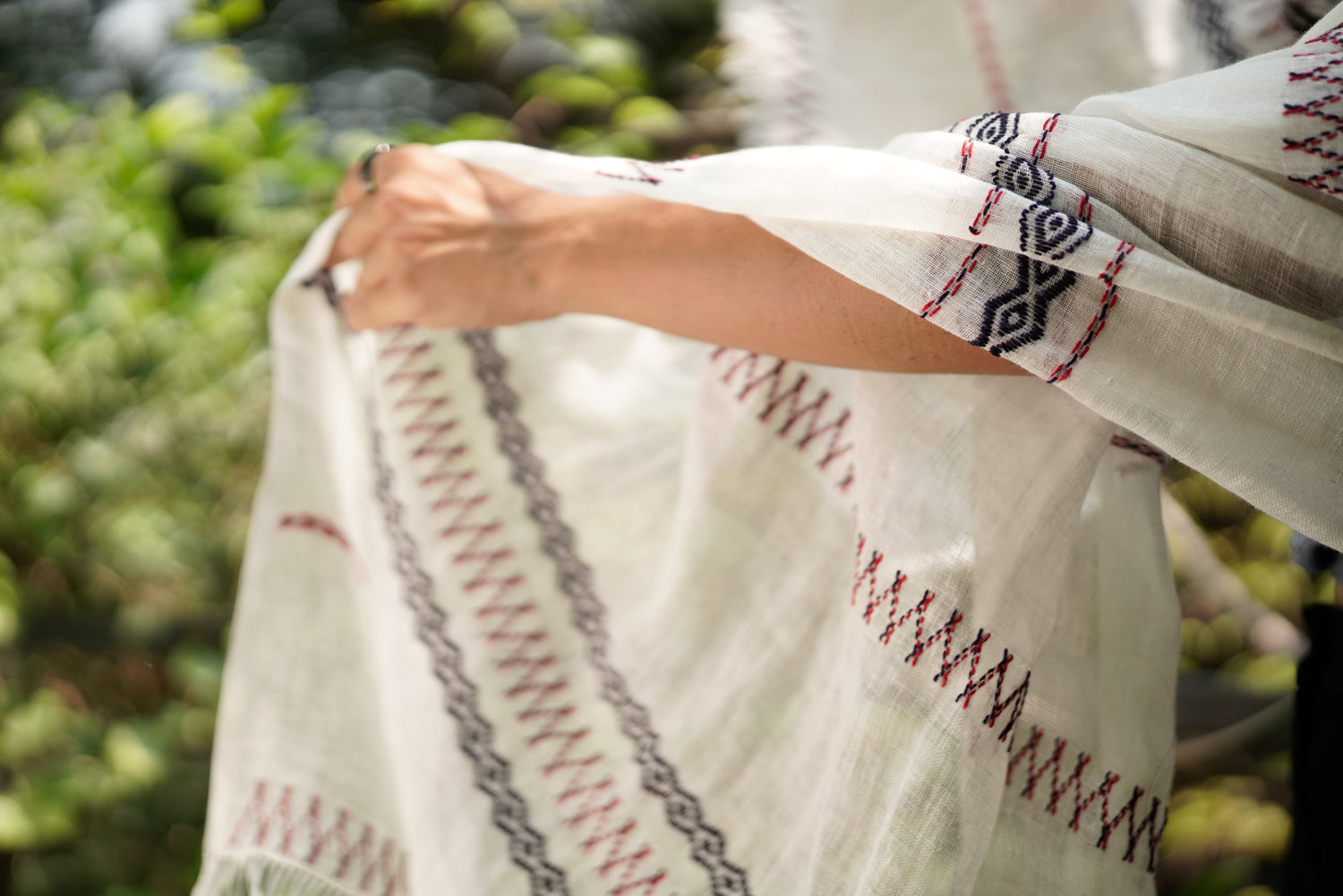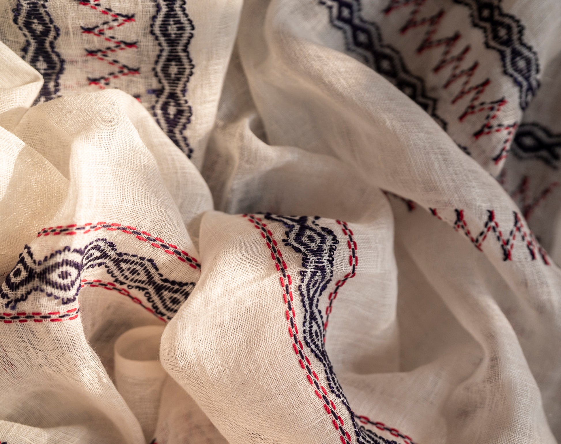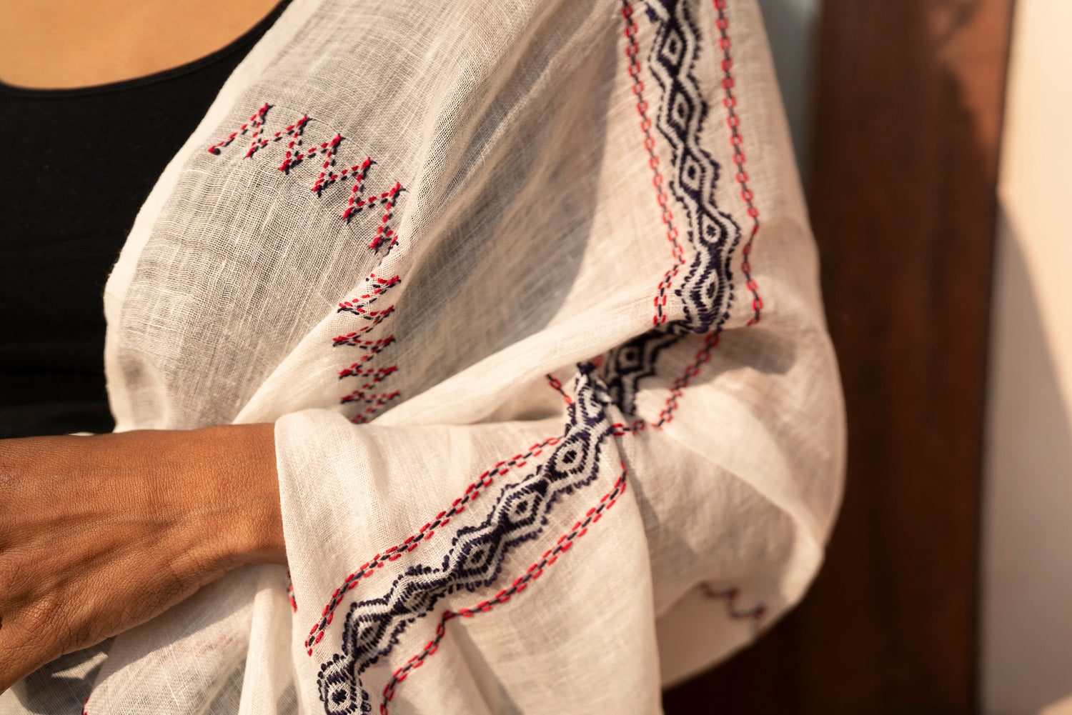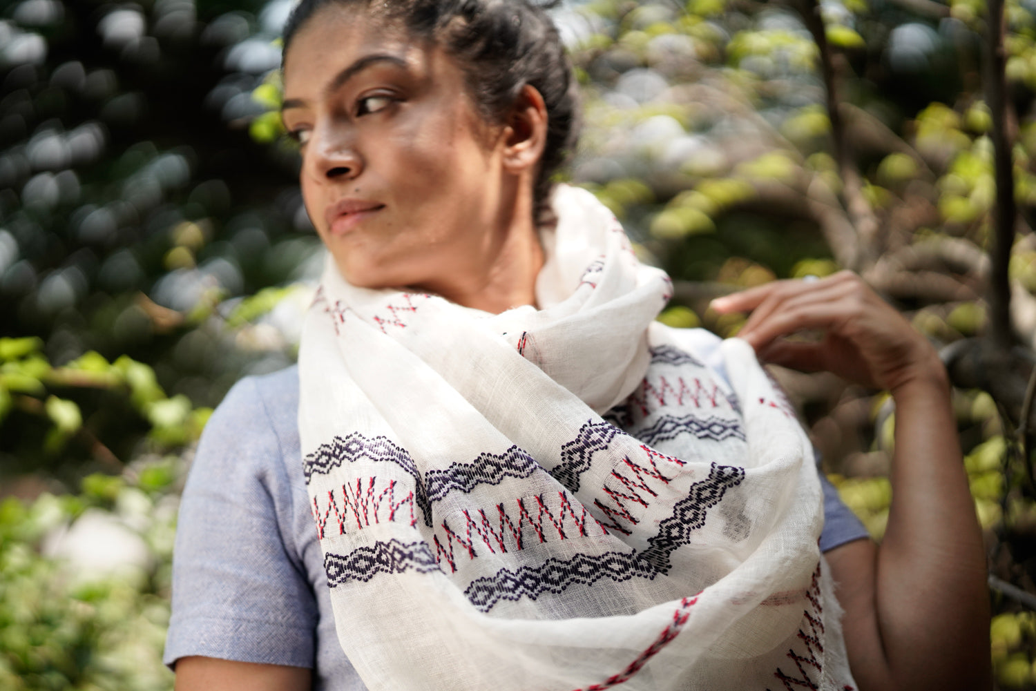 Working with delicate linen—far more refined than regular cotton—each stole takes between 8 to 10 days of meticulous hand embroidery by our artisan. Read our story below.