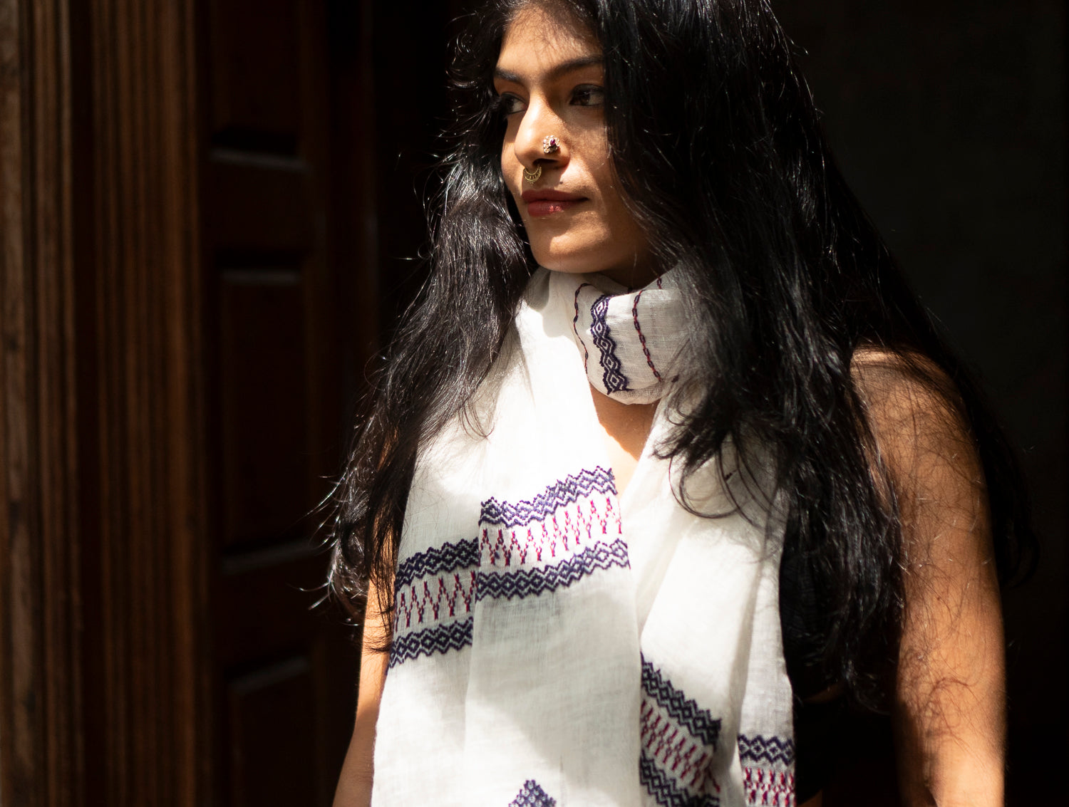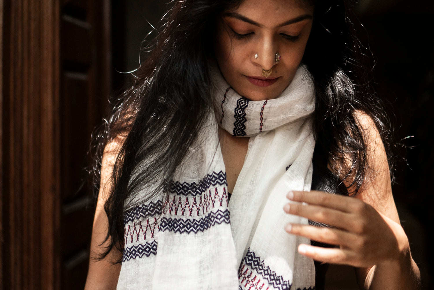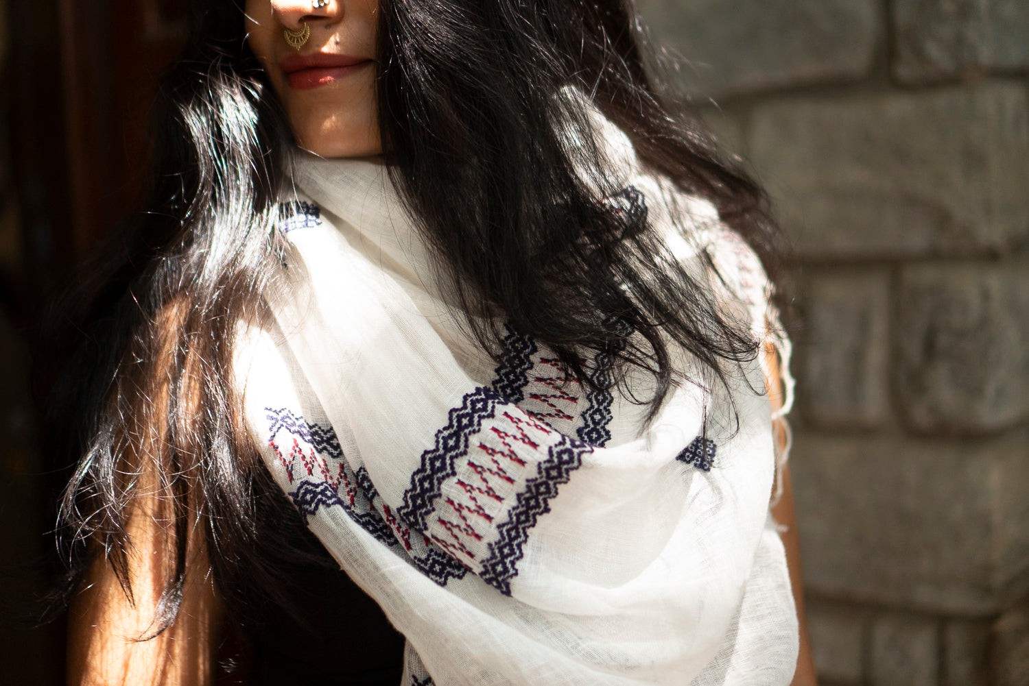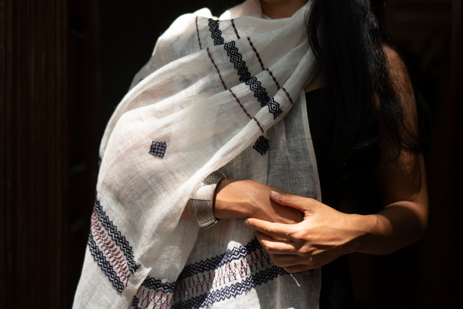 Working with delicate linen—far more refined than regular cotton—each stole takes between 8 to 10 days of meticulous hand embroidery by our artisan. Read our story below.