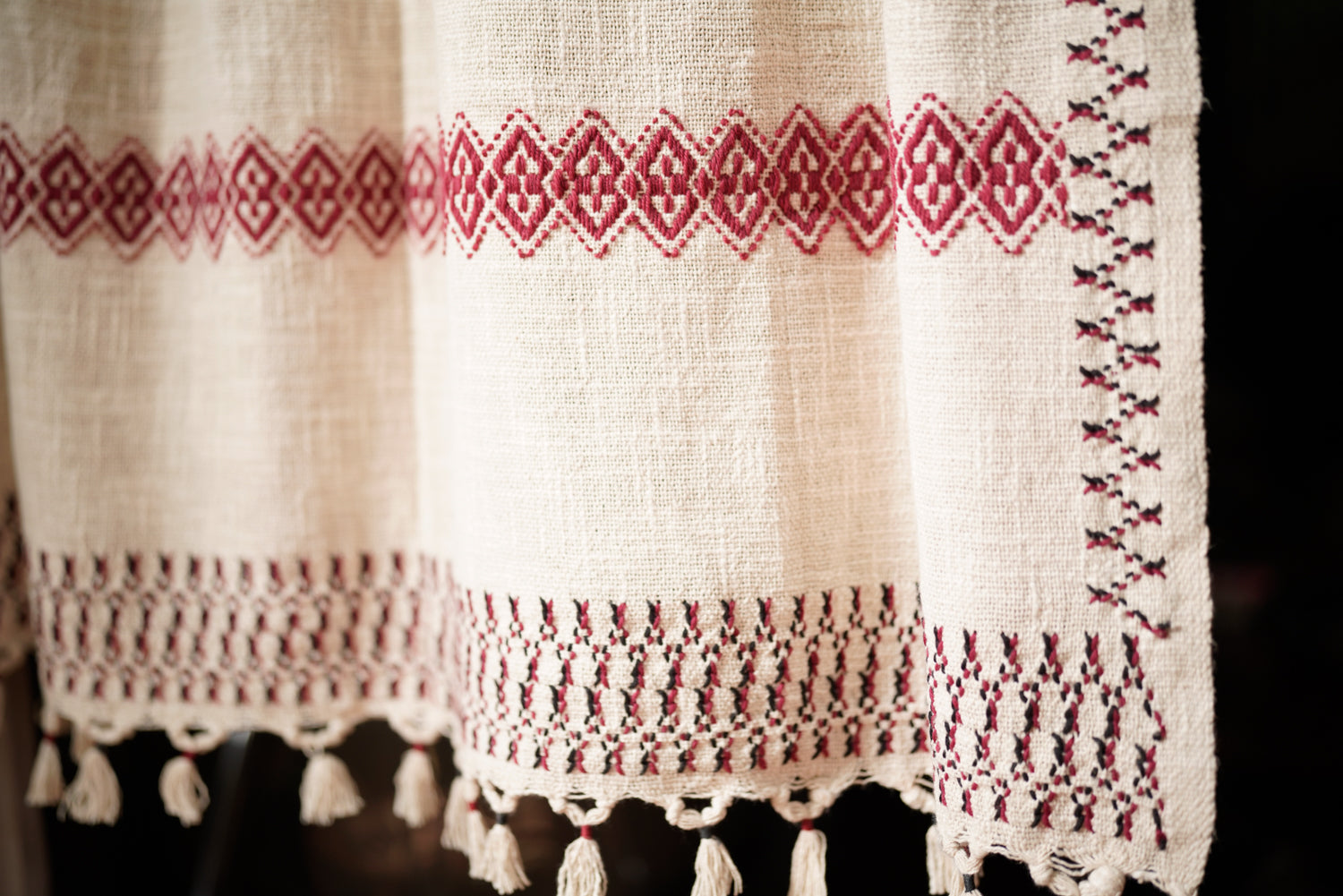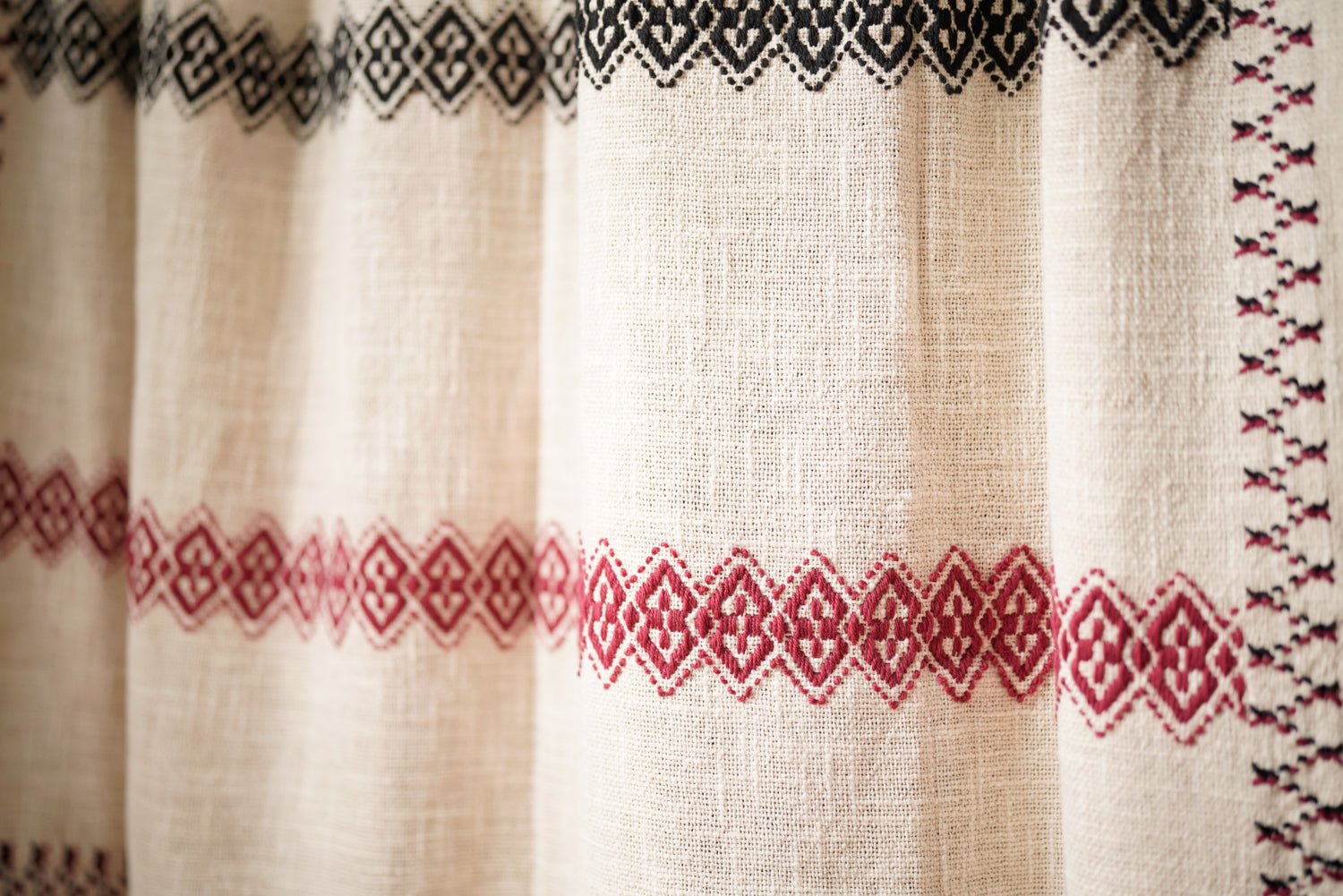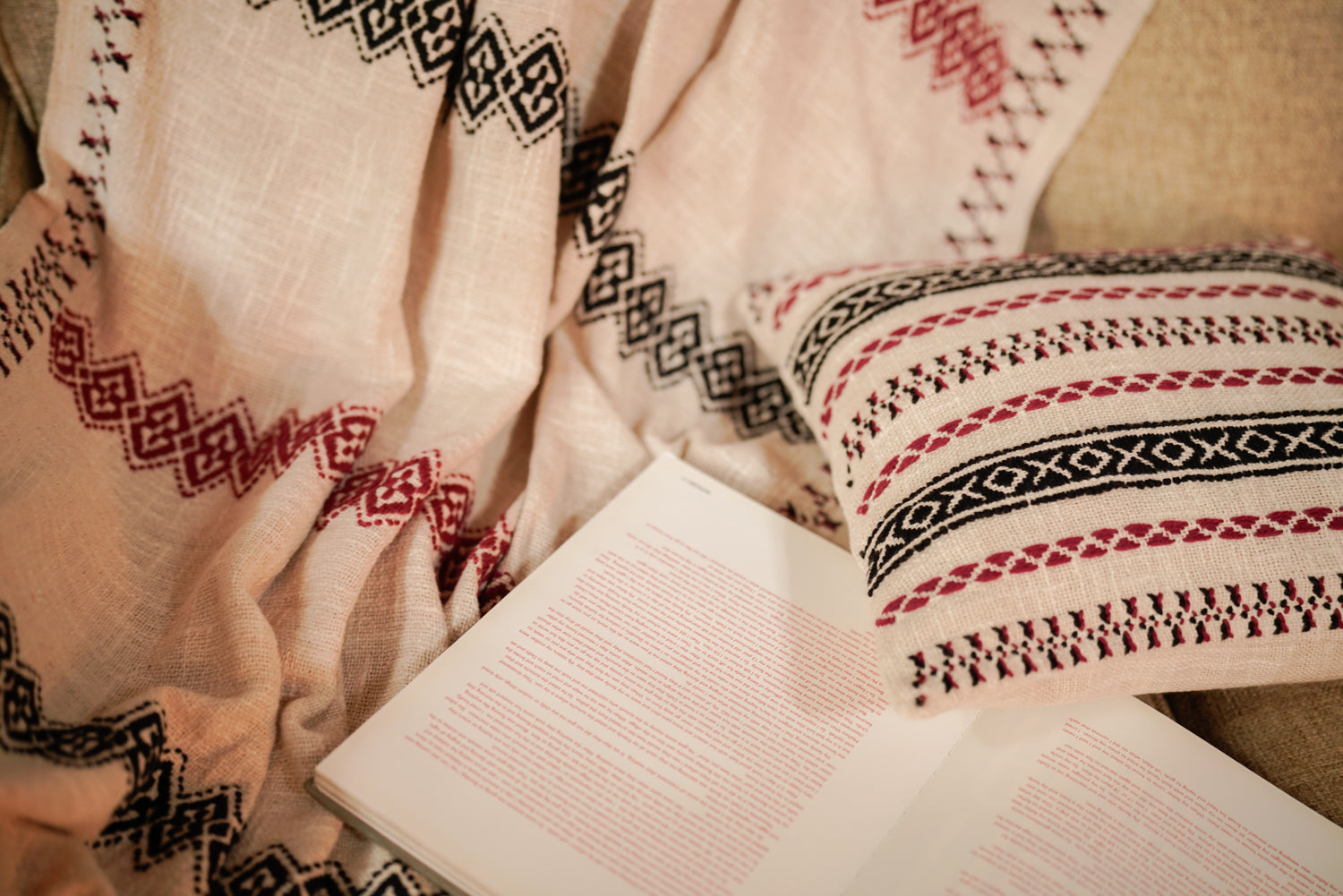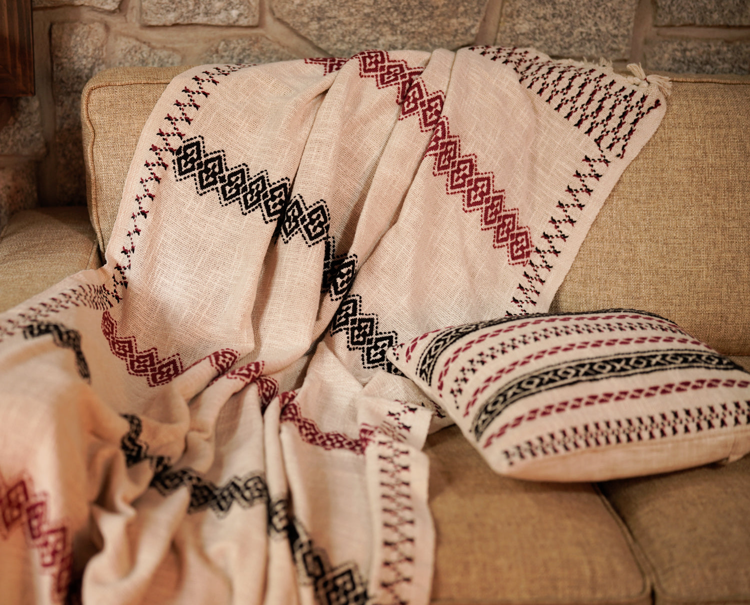 Our throws are woven from 100% cotton, with slub yarn lending a natural texture and weight that makes them ideal for air-conditioned spaces or cooler climates. Onto this heavier cotton base, Toda women embroider using 100% wool yarn, the stitches rendered with striking dimensionality and depth.