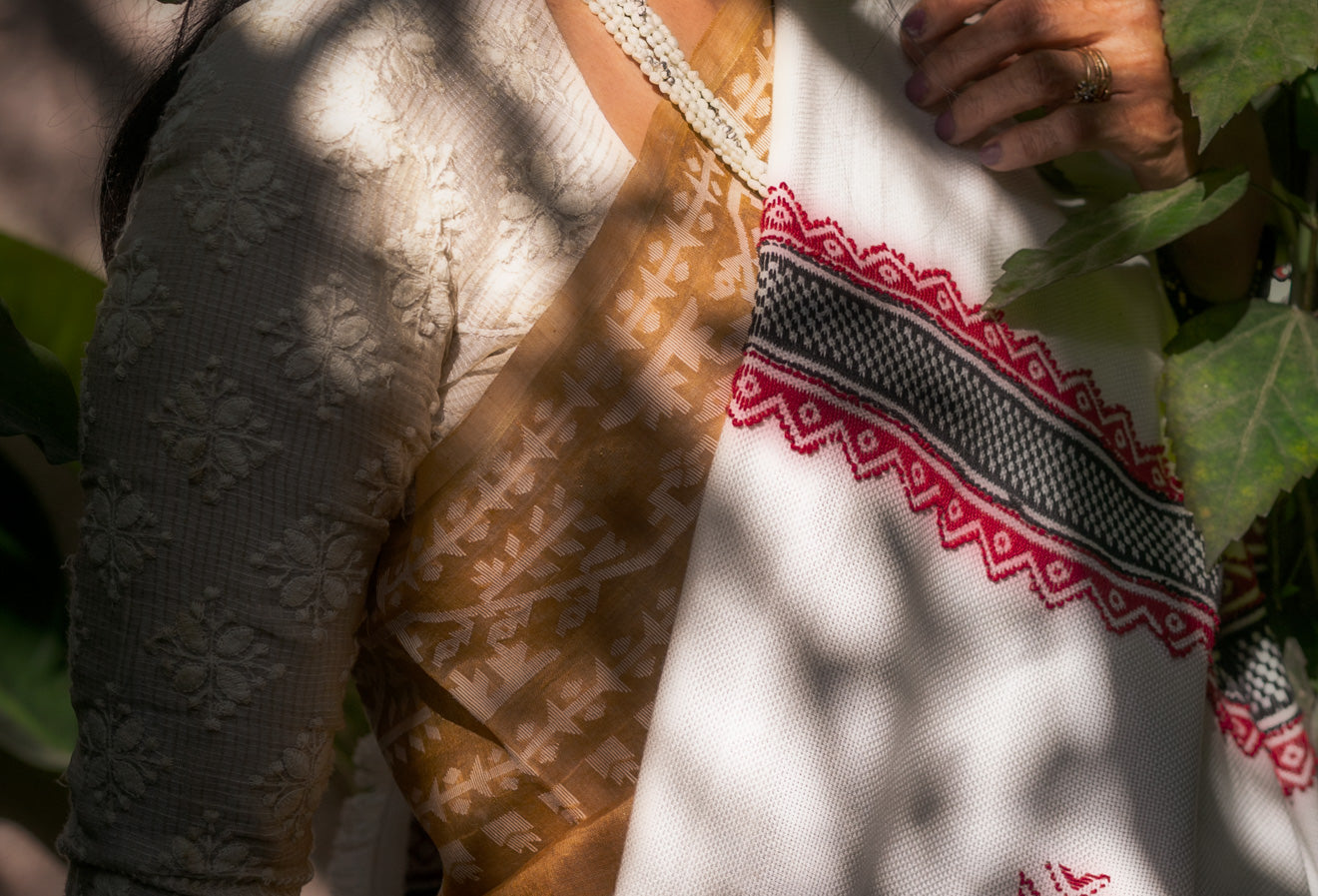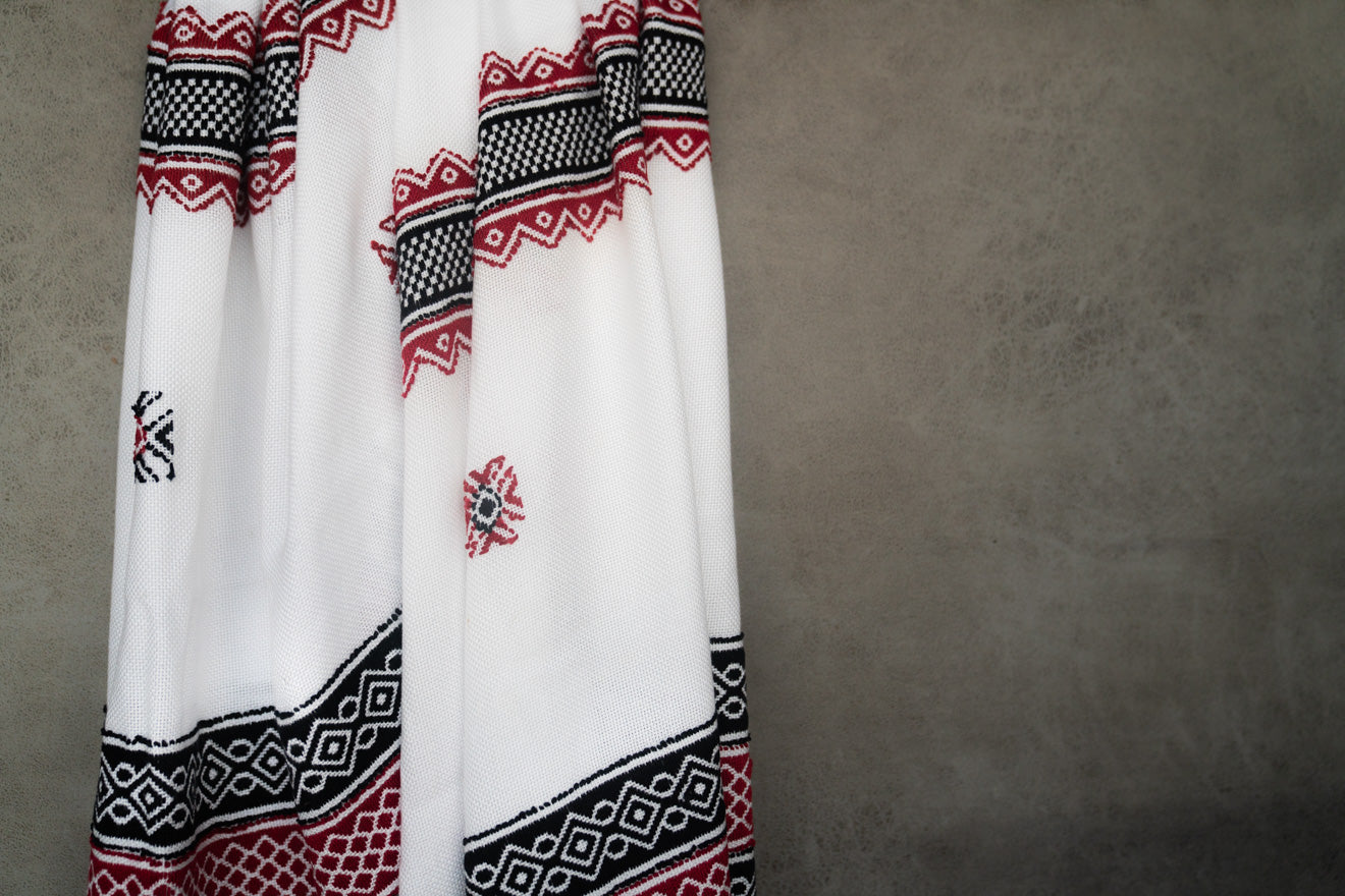 The Toda shawl is an exquisitely made classical apparel. A larger version or the puthkuzhy is the traditional garment of the indigenous Todas of the Nilgiris. This renewed version showcases the GI-tagged embroidery on exceptionally drapey, lightweight and luxurious Tencel. Designed with a contemporary aesthetic, the ancient motifs in this shawl represent elements of the Toda landscape including mountains, honeycombs and botanicals.