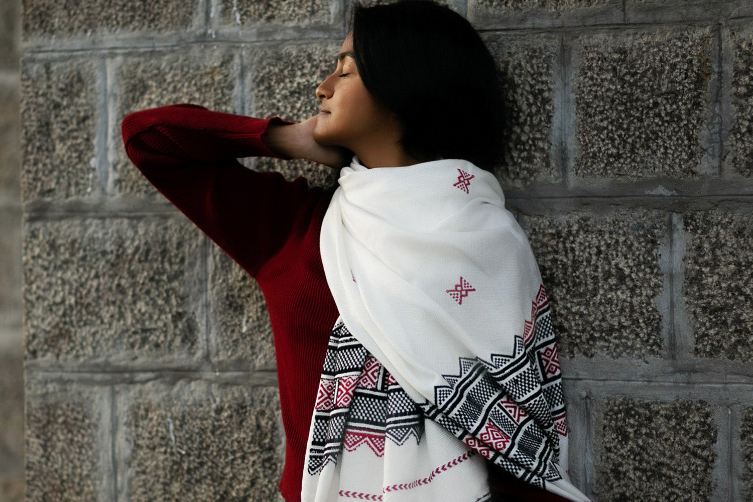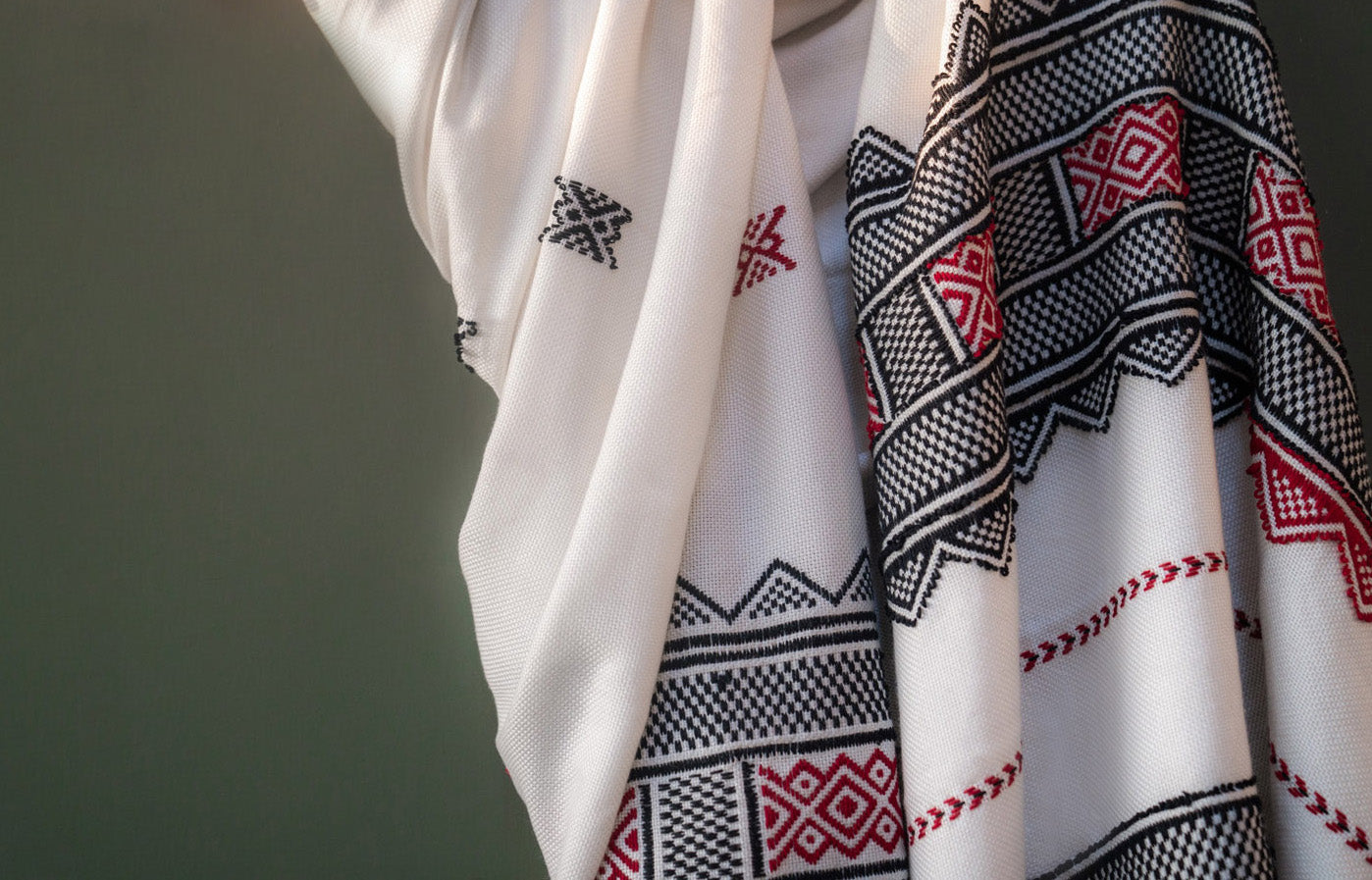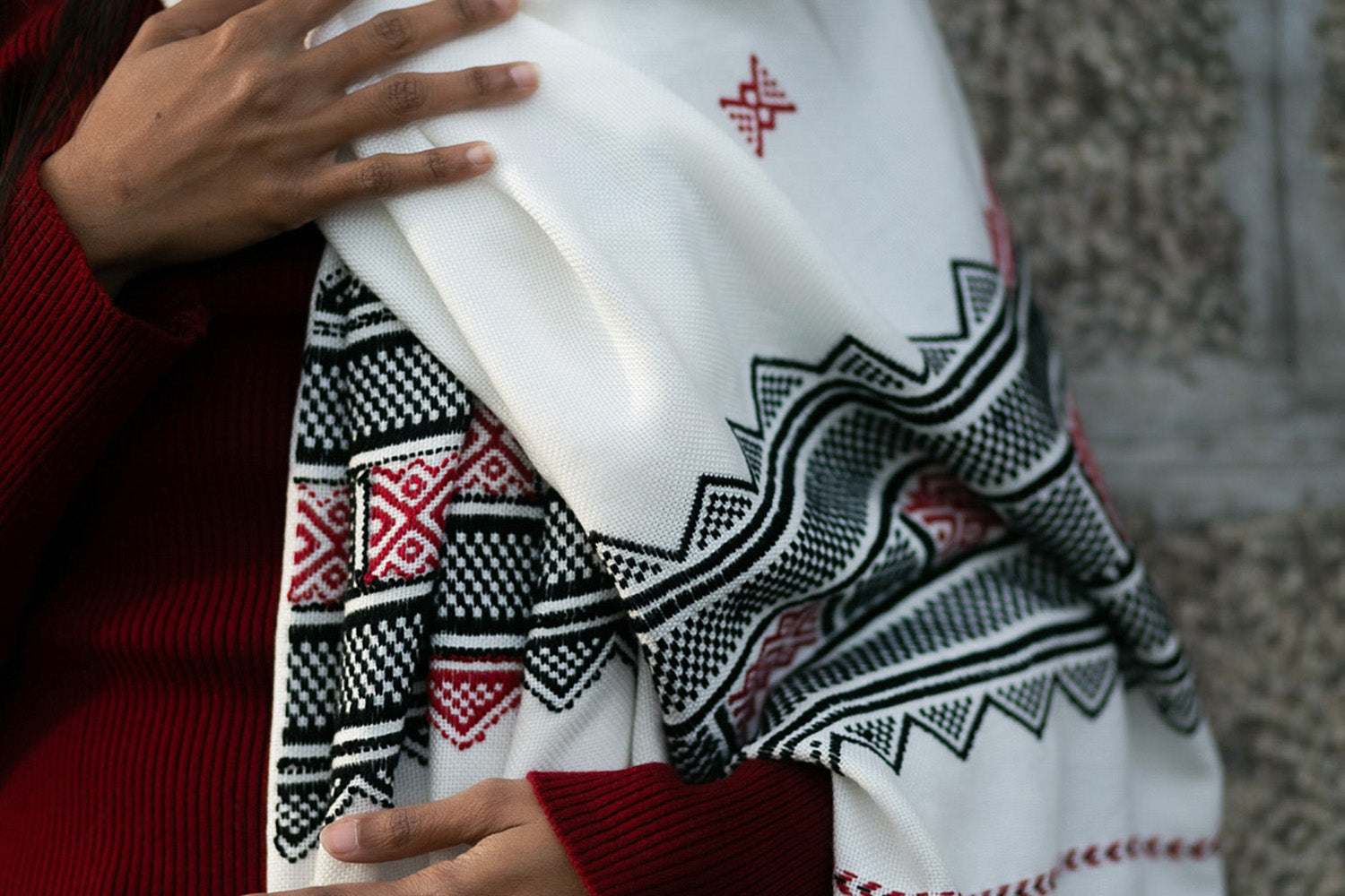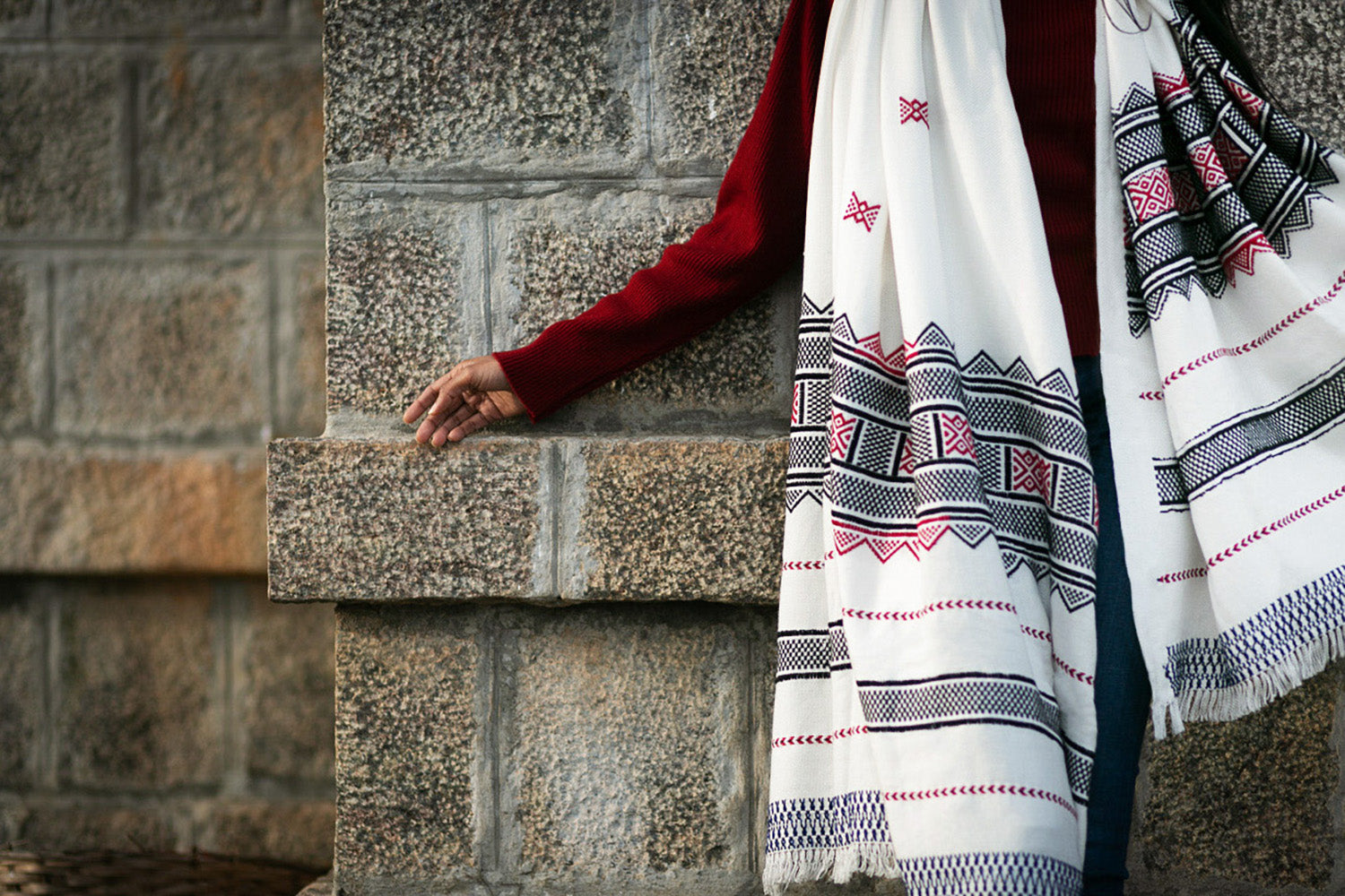 The Toda shawl is an exquisitely made classical apparel. A larger version or the puthkuzhy is the traditional garment of the indigenous Todas of the Nilgiris. This renewed version showcases the GI-tagged embroidery on exceptionally drapey, lightweight and luxurious Tencel. Designed with a contemporary aesthetic, the ancient motifs in this shawl represent elements of the Toda landscape including mountains and botanicals among others.