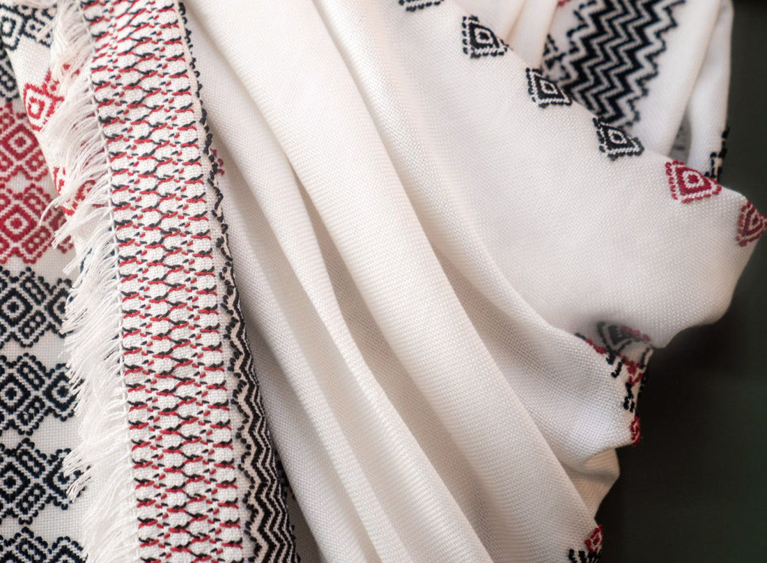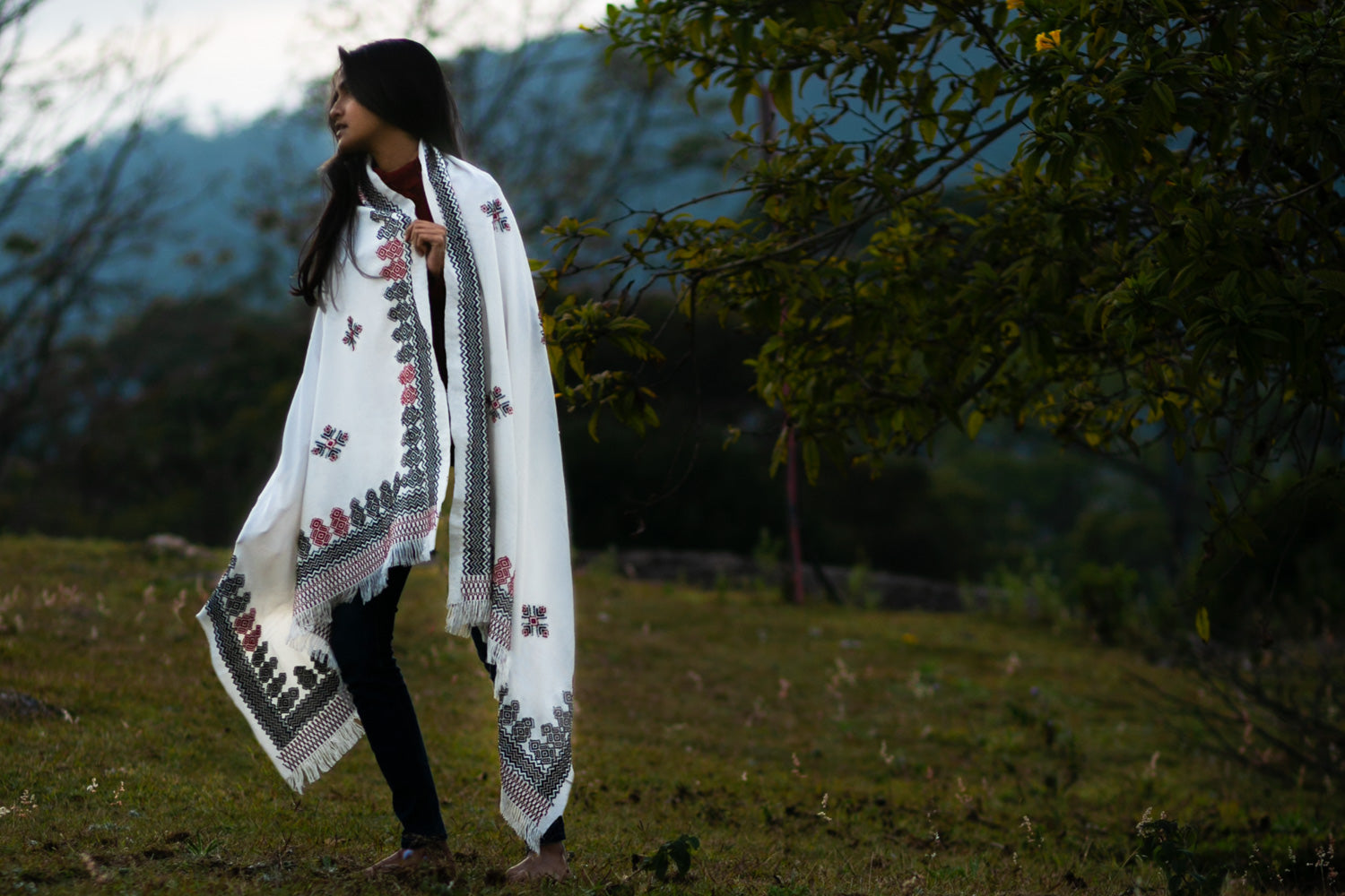 The Toda shawl is an exquisitely made classical apparel. A larger version or the puthkuzhy is the traditional garment of the indigenous Todas of the Nilgiris. This renewed version showcases the GI-tagged embroidery on exceptionally drapey, lightweight and luxurious Tencel. Designed with a contemporary aesthetic, the ancient motifs in this shawl represent elements of the Toda landscape including mountains and forest botanicals among others.